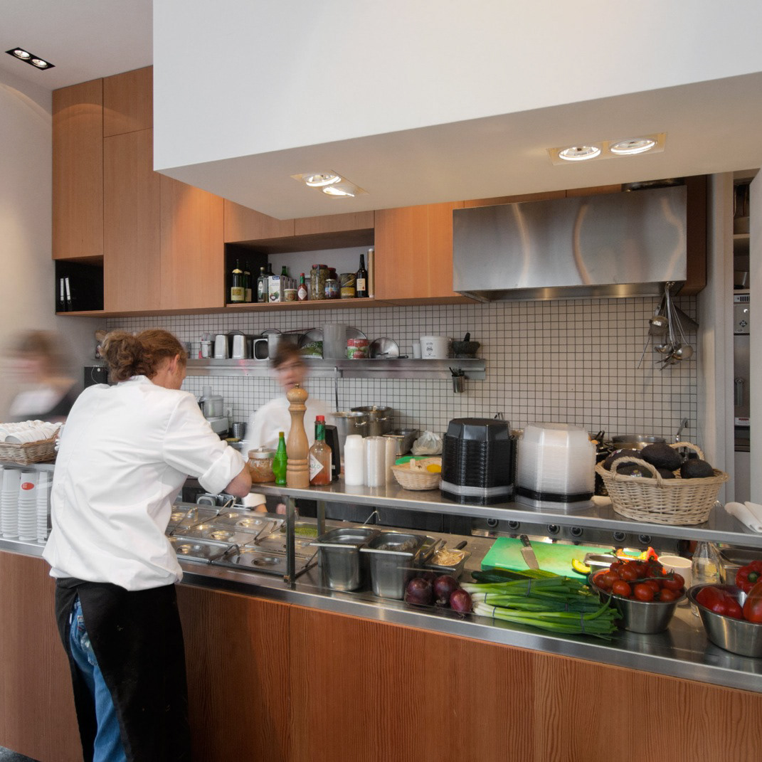 Ontwerp en uitvoering van winkelinterieur en visuele communicatie voor eetwinkel Ikook in Utrecht.