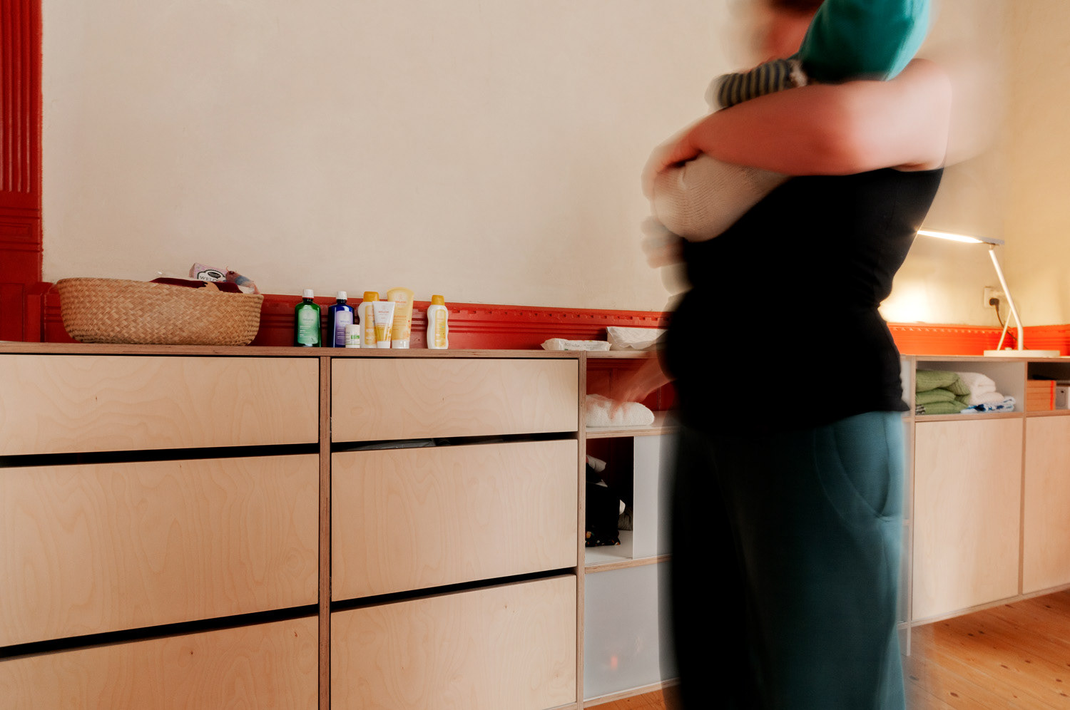 Commode, kledingkast en archiefkast uit wit betonplex, en berkenmultiplex.